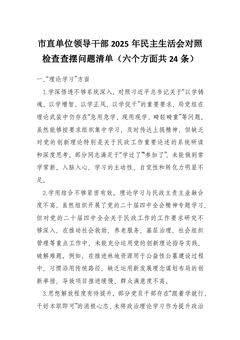 市直单位领导干部2025年民主生活会对照检查查摆问题清单(六个方面共24条)