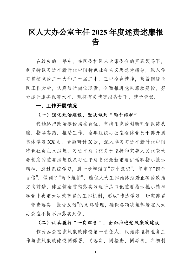 首页精选范文区人大办公室主任2025年度述责述廉报告
