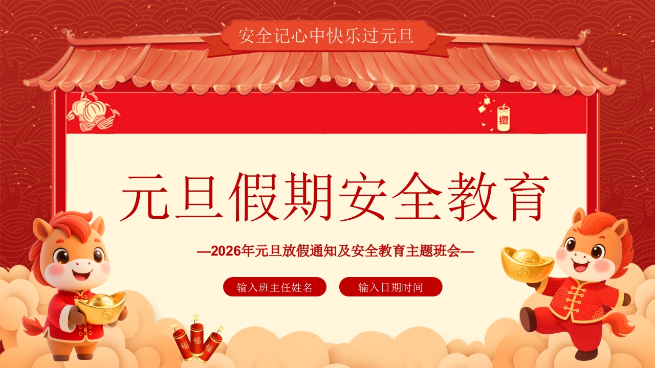 元旦假期安全教育PPT红色卡通风2026马年元旦放假通知及安全教育主题班会