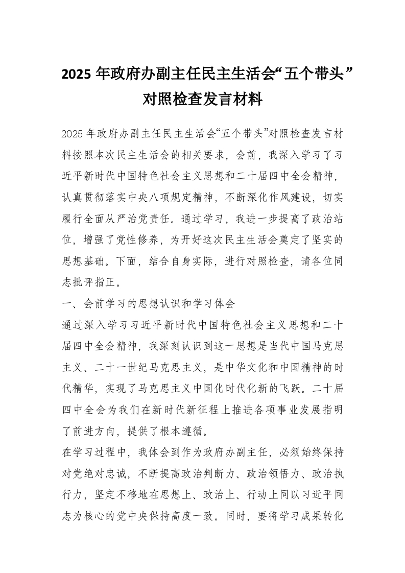 2025年***办副主任民主生活会“五个带头”对照检查发言材料
