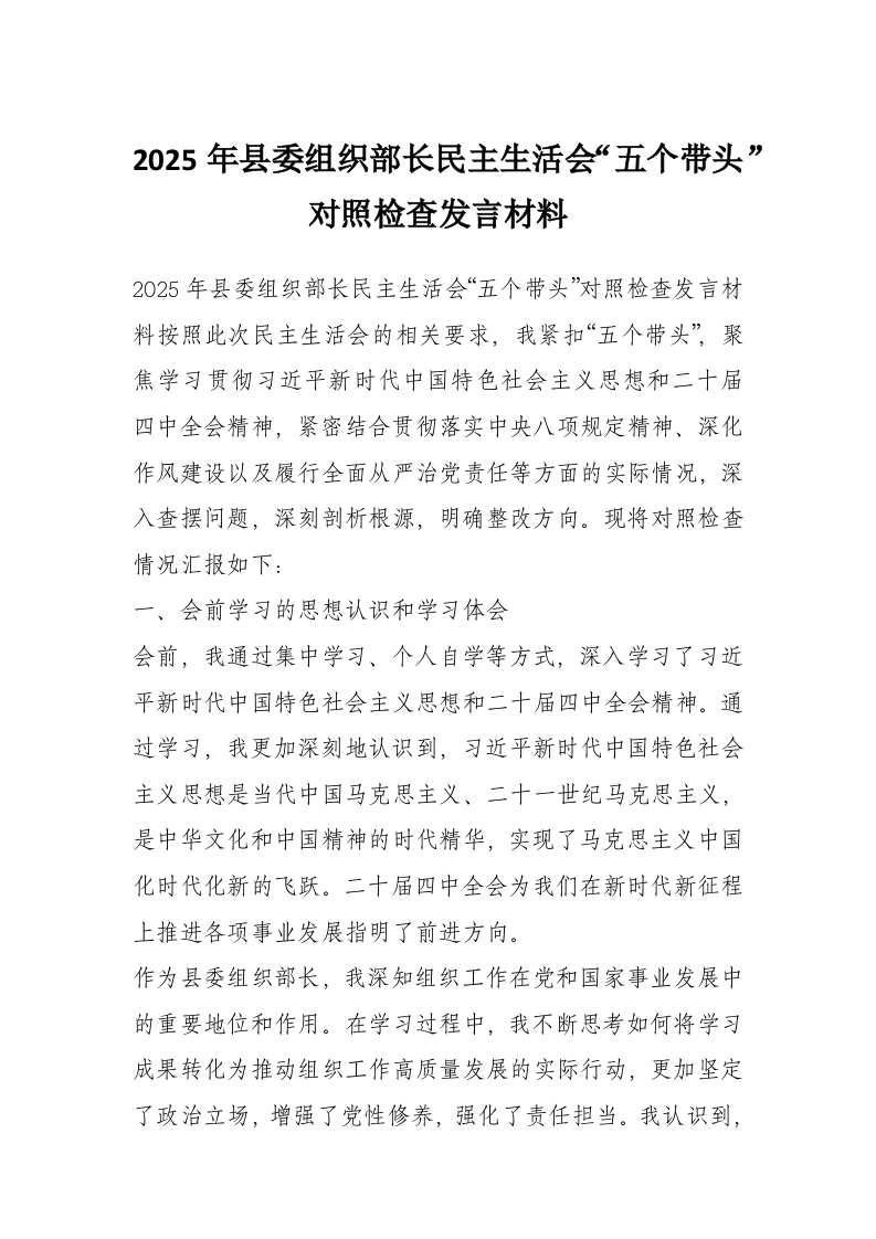 2025年县委组织部长民主生活会“五个带头”对照检查发言材料