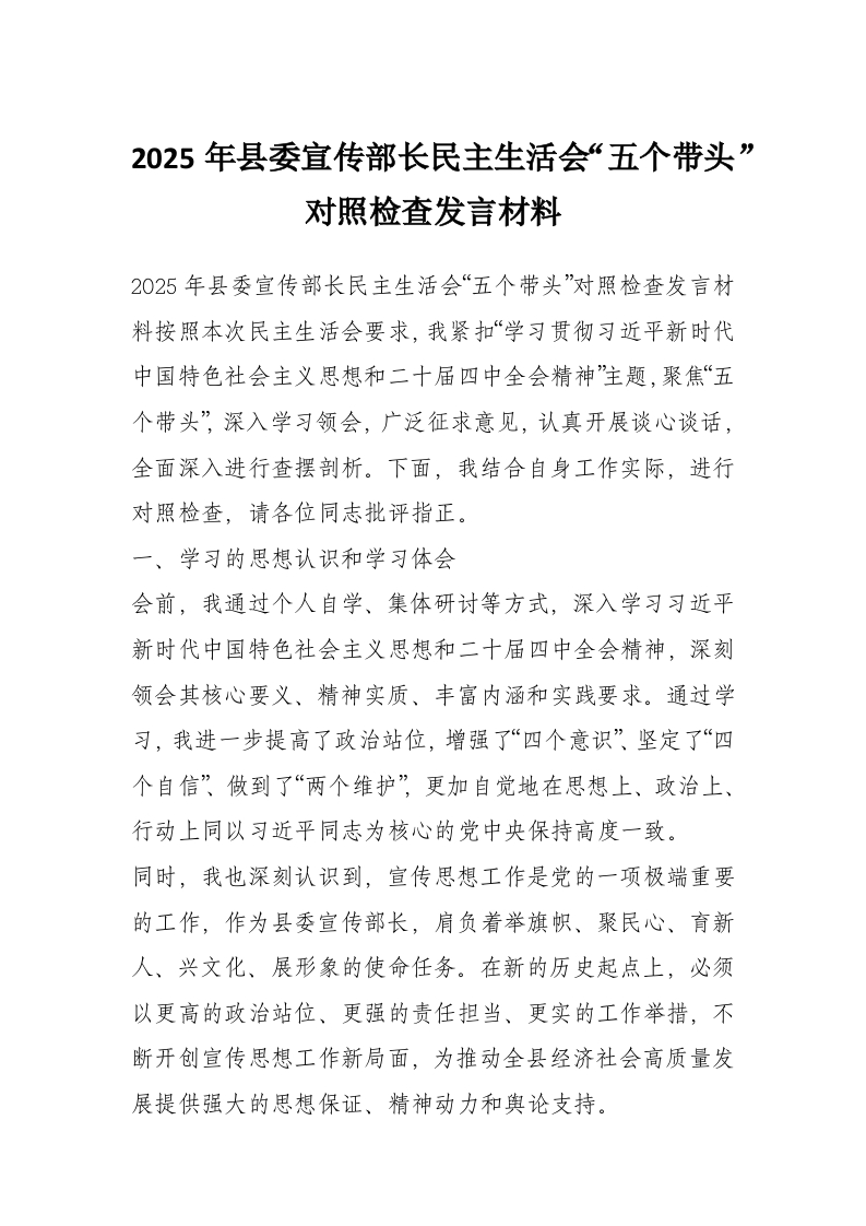 2025年县委宣传部长民主生活会“五个带头”对照检查发言材料