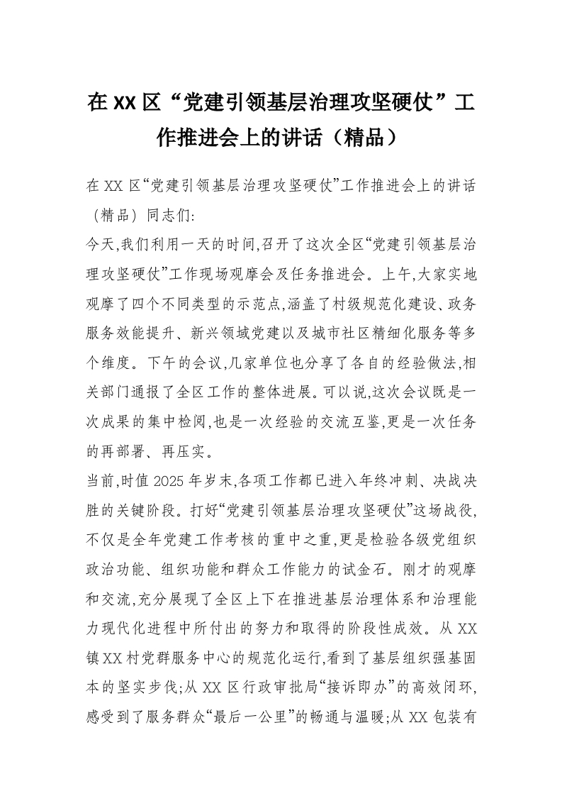 在XX区“党建引领基层治理攻坚硬仗”工作推进会上的讲话(精品)