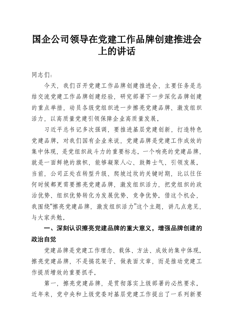国企公司领导在党建工作品牌创建推进会上的讲话