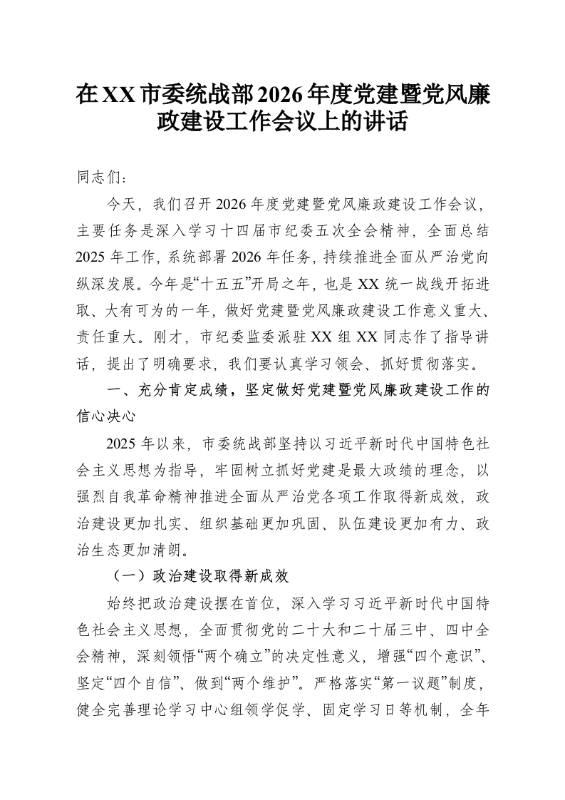 在XX市委统战部2026年度党建暨党风廉政建设工作会议上的讲话