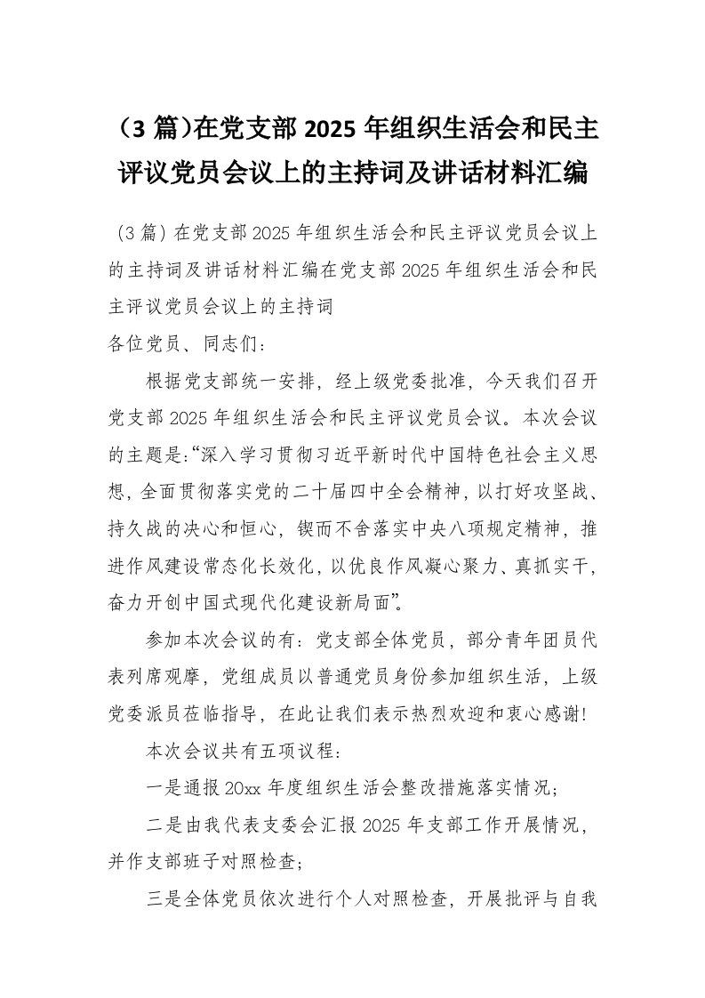 (3篇)在党支部2025年组织生活会和民主评议党员会议上的主持词及讲话材料汇编