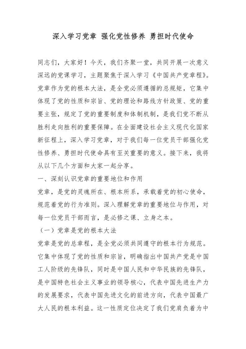 深入学习党章 强化党性修养 勇担时代使命