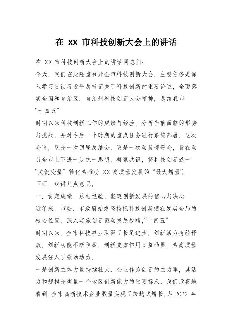 在 XX 市科技创新大会上的讲话
