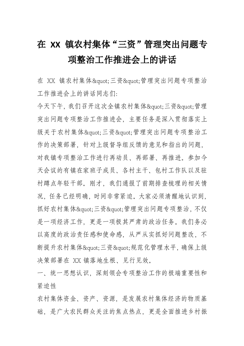 首页工作文档在 XX 镇农村集体“三资”管理突出问题专项整治工作推进会上的讲话